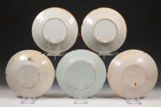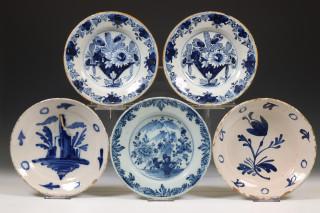 Delft, vijf diverse aardewerken borden, 17e/18e eeuw;