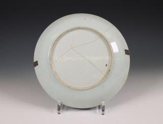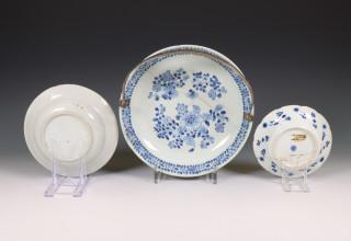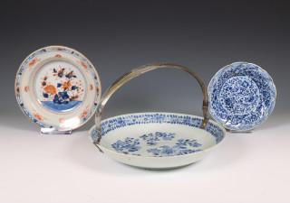 comprising a silver-mounted blue and white floral plate, a small moulded dish and a deep Imari dish (the blue and white dishes broken and reglued with various damages)