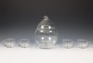 Bestaande uit bowl met deksel en schotel en vier bowlglazen. Allen voorzien van geëtst monogram.