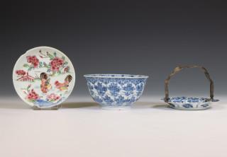 comprising a bowl and a silver-mounted saucer, each decorated with flowers and a famille rose 'double cockerel' saucer (chips, cracks, damages)
