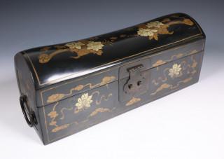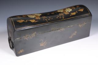 Uitgevoerd met decoratie van pioenrozen in geel tinten. Koperen beslag.