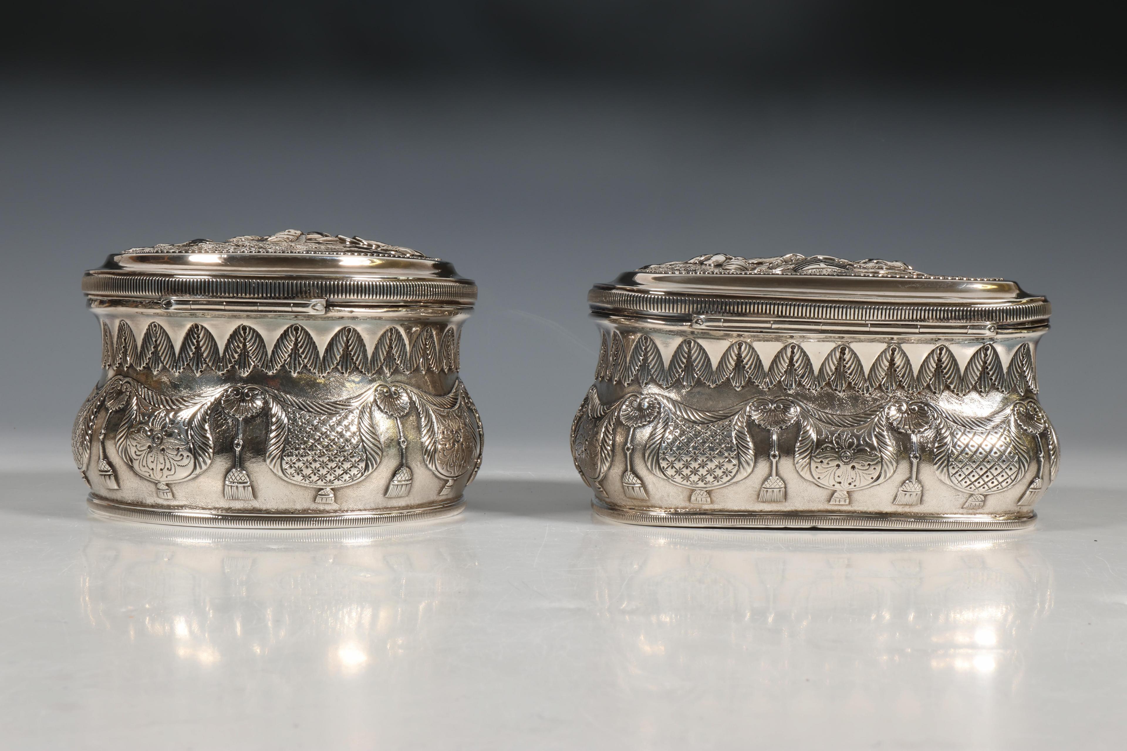 een rond en een langwerpig model versierd met schelp-, blad- en quirlande versieringen, scharnierende deksels, mt. Jan Georg Grebe Jr. Rotterdam 1828, 1e gehalte,