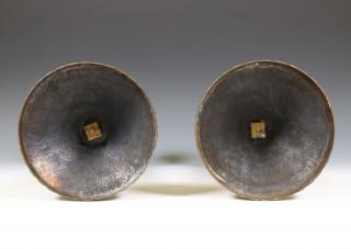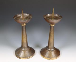 Amsterdamse School, paar koperen gehamerde en gedreven penkandelaars, ca. 1925;