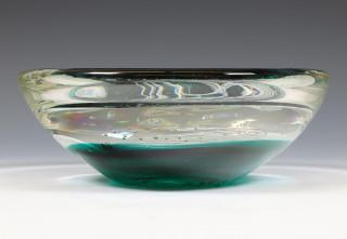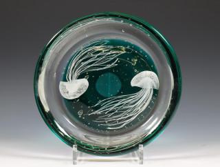 Italië, dikwandig glazen sierschaal met ingesloten glazen decoratie van kwallen in zeegroen fond, ca. 1980