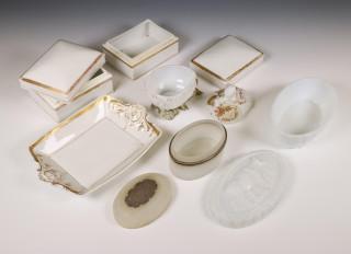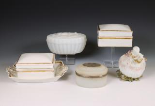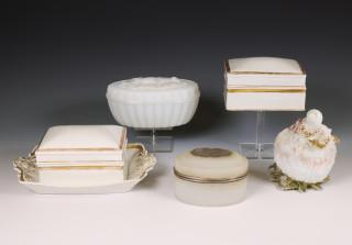 Vijf diverse glazen en porseleinen dekseldozen, 19e-20e eeuw. Waaronder Vallerysthal