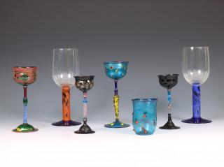 w.b. met slinger in de stam. Hierbij een blauw glazen beker met rode accenten.
