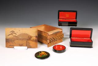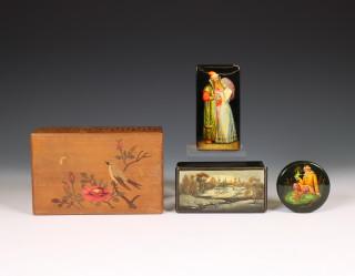 Uitgevoerd met polychrome decoratie van Mount Fuji en vogel, aan de zijdes parqueterie band. HIerbij drie Russische lakwerk doosjes.