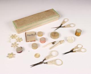 Diverse onderdelen van naaigarnituur uitgevoerd in parelmoer, 19e eeuw;