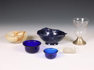 Hierbij vier diverse (binnen)bakjes en geslepen glas op zilveren voet.