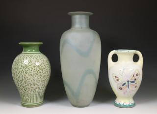 hierbij plateel vaas met schildering van vlinders en aardewerk vaas met decoratie van bladeren.