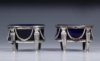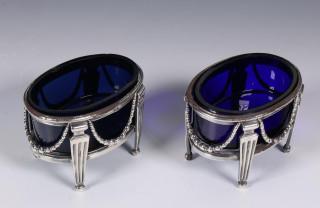 ovaal model met ajour houders op vier tapstoelopende gecanneleerde pootjes verbonden door kraalvormige slingers, met blauw glazen (verschillende) binnenbakjes, mt. onduidelijk, belastingstemopel 1814-1893 grote buitenlandse werken, 1e gehalte (Z1), twee pootjes verbogen, een met geoxideerd randje,