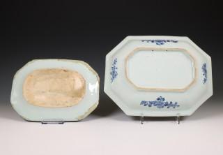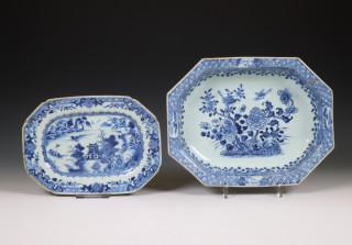 each of oblong octagonal shape, one deep dish painted with birds among flowers and a smaller dish decorated with a pagoda in a river landscape (both with small damages)