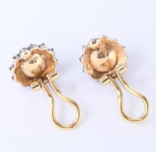 14 kt. Gold with silver ear clips, centrally set with a cultured pearl in an entourage of rose-cut diamonds. Maker's mark LS van Meggelen, The Hague, from 1956