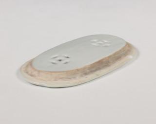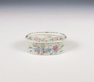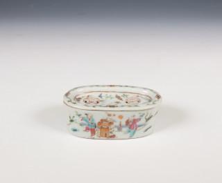 the oval box painted with figures and boys in a garden, the cover with two openworked roundels (small rim chips)