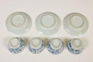 China, set of four canted blue and white porcelain cups and three saucers, 18th century,