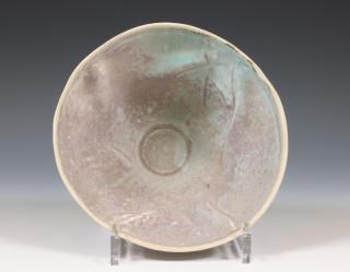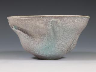 gevormde porseleinen kom met blauw grijs glazuur. Gemonogrammeerd en gedateerd '97