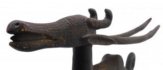 with horizontal horns and coiled tails, the male chiwara with curved horns.