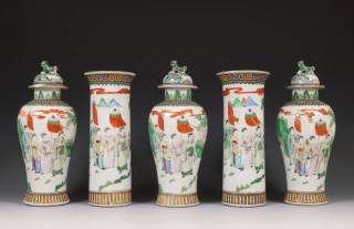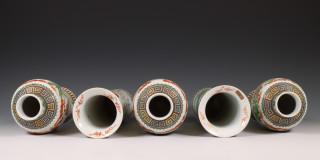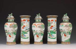 comprising a set of three baluster jars and covers and a pair of trumpet vases, each decorated with a procession of dignitaries in a landscape (two covers chipped)