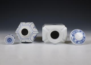 beide beschilderd in onderglazuur blauw met gestileerde bloemmotieven, een rechthoekig van vorm en de ander zeskantig, onderzijdes gemerkt