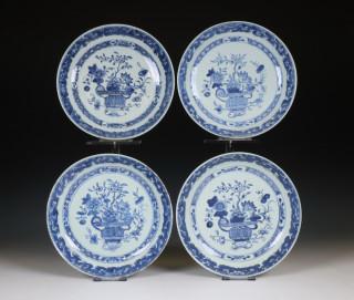 each decorated with an abundant flower-basket filled with lotus, prunus, chrysanthemum and pomegranate (two plates with hairline, all with small rim frits)