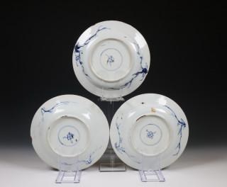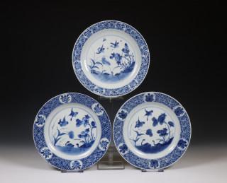 China, set of three blue and white porcelain 'duck' plates, 18th century,