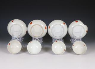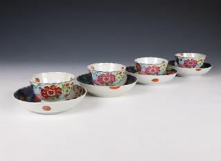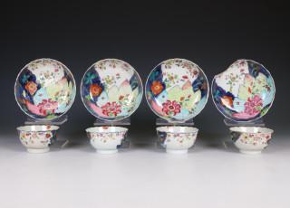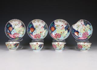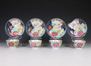 China, set of four famille rose 'tobacco leaf' porcelain cups and saucers, ca. 1770,