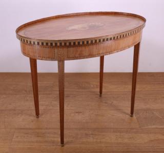 Ovale met satijnhout gefineerde eikenhouten theetafel met opstaande rand, Louis XVI stijl, 19e eeuw;