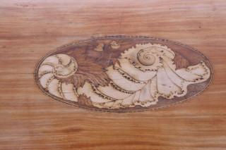 Uitgevoerd marqueterie op het blad met schelp, intarsia rondom en op de poten. Glazen blad met twee ringen.