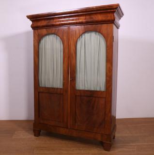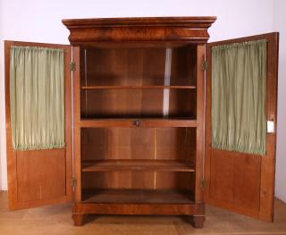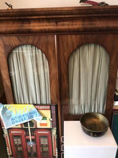 Uitgevoerd met twee deuren met getoogde ruiten, lade onder het blad. Groen zijde gordijnen. (beschadigingen).