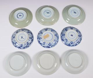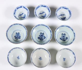 comprising a set of three celadon-backed cups and saucers, a set of three cups and saucers painted with censers, a set of three saucers with flower-pot and a set of three flower-shaped cups (some hairlines and chips)