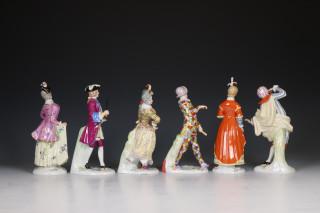 Fürstenberg, groep van zes porseleinen Commedia dell' Arte figuren, 20e eeuw,