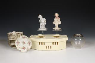 decor 'Classic Rose', samen met een theestoof, twee figuurtjes en een glazen vaasje