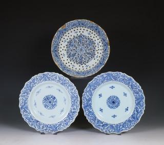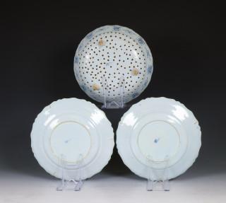 Delft, De Porceleyne Byl, blauw-wit aardewerken fruitschaal en twee borden, 18e eeuw,