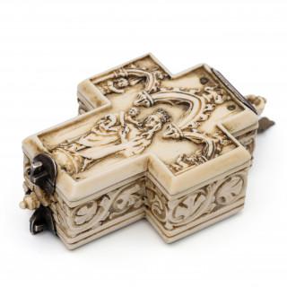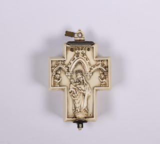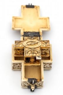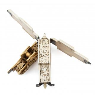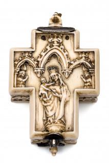 Uitgevoerd met gestoken reliëfs van o.a. Madonna met kind. Scharnierende voor en achterzijde. binnenzijde met scharnierend en opengewerkt radaruurwerk, wijzerplaat met een wijzer. (Met Cites verklaring).