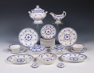 beschilderd met gestileerde bloemen, bestaande uit een dekselterrine, twee mandjes en onderschotels, een sauskom, twee kommen, twee zoutvaatjes, een dekselkruikje en verschillende schotels, alle in klein formaat (een kom gelijmd)