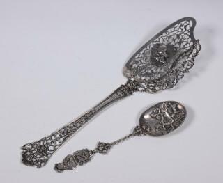 ajour visschep met oudhollandse voorstelling en o.a. eekhoorntje, mt. Lieuwe Schoonhoven Middelstum/Groningen 1900 en idem lepel met wapen van Leiden, beide 2e gehalte,