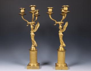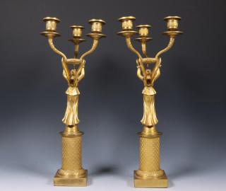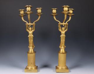 Frankrijk, paar vuurvergulde bronzen drielichts kandelaren, Empire;