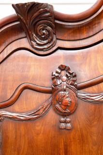 Uitgevoerd met gebombeerde onderkast met drie laden. De bovenkast met twee deuren en gebogen kap, gestoken houten decoratie van medaillons, strikwerk en guirlande. Het interieur met legplanken en laden.
