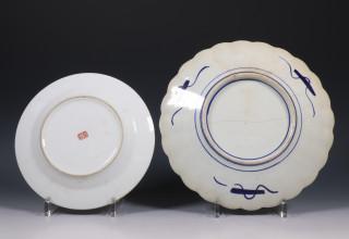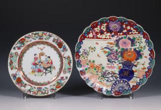de schaal gedecoreerd met bloemen (bodembarst) en het bord met figuren