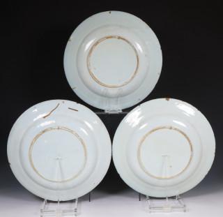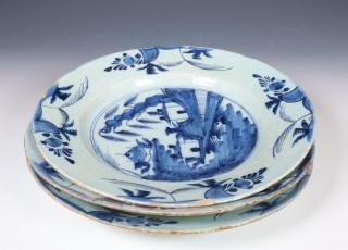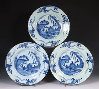 Delft, drie blauw wit aardewerk schotels, 18e eeuw;