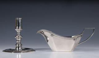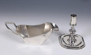 op achthoekig voet met ronde balustervormige stam en cilindrische kaarsenhouder, mt. IE, toegeschreven aan James England Dulbin 1799, versierde sauskom schuitvormig en achtkantig met vleugelvormig oor, gemerkt Alvin en genummerd M5502, sterling, kandelaar licht verbogen, deukjes in kom,