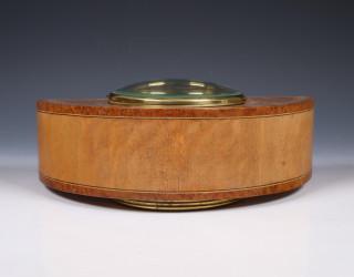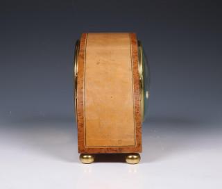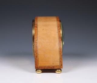 De halfronde kast opgelegd met vogeloogjes esdoorn- en notenhout, parelmoer accenten. Gegoten vernikkelde wijzerplaat met vergulde cijfers. Geheel staande op koperen bolpoten.
