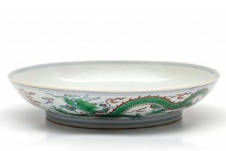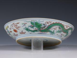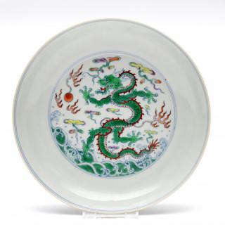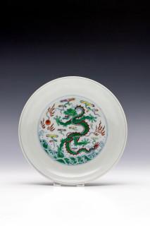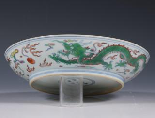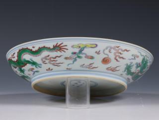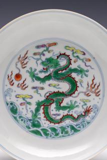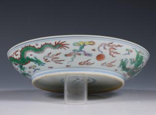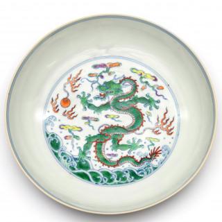 raised on a straight foot, the centre decorated with a fierce five-clawed dragon emerging from crashing waves and chasing the flaming pearl amongst cloud and fire scrolls (small firing flaw)