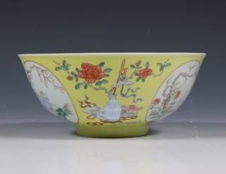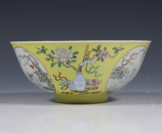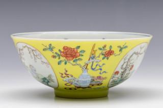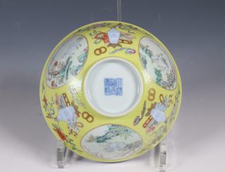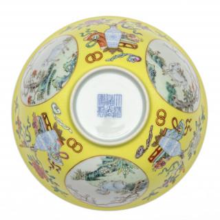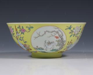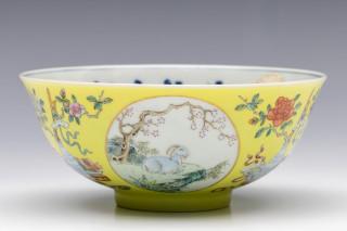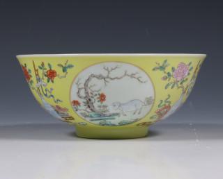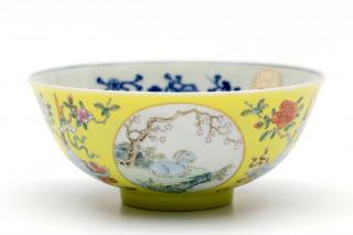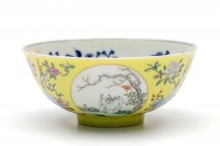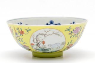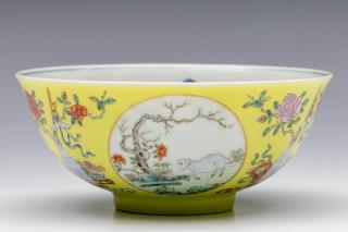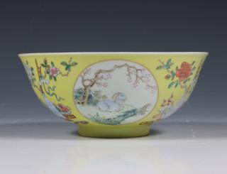 China, famille rose yellow-ground 'three rams' medallion bowl, Daoguang six-character seal mark and of the period (1821-1850),
