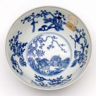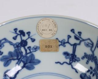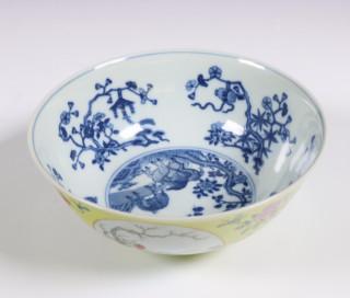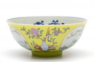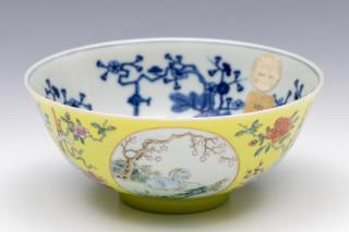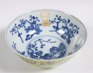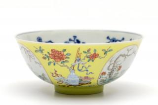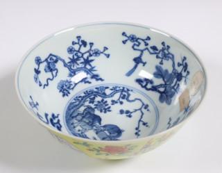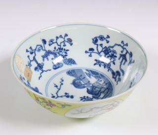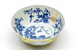 decorated on the exterior with three medallions of rams below flowering branches, reserved on a bright yellow sgraffiato ground embellished with three groups of precious objects, and another medallion of three rams and four clusters of flowers and precious objects in underglaze blue to the interior, with label 'Sotheby's Hong Kong Ltd., May 86, lot 147'