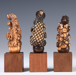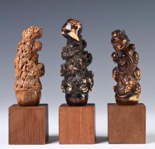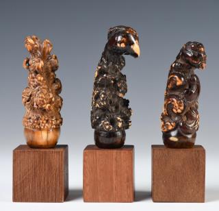 consisting of an old item with indistinct features and topped by a zoomorphic head, an old item topped by a parrot's head, the back showing a leafpattern, and an item showing foliage.
