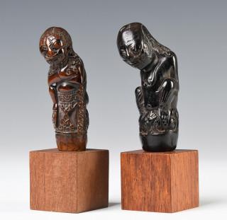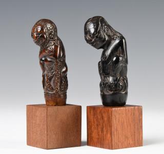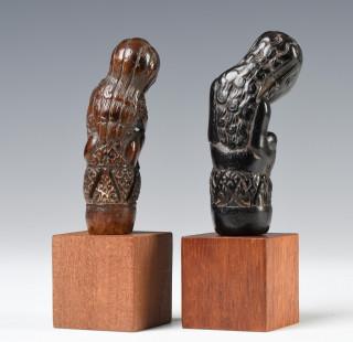 the brown wooden hilt shaped as an ancestor figure with long flowing hair, the other black one shaped as a raksasa wearing a necklace.