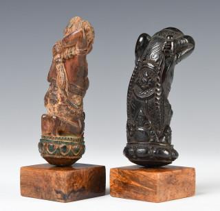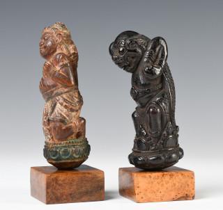 one in blackish wood standing demon figure, Buta, the other with traces of pigments, also depicting Buta holding a weapon at his back.