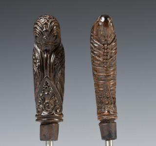 one showing a stylized bird, the other a stylized long horn beetle. Both with an iron mendak.