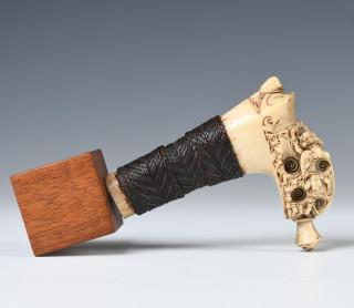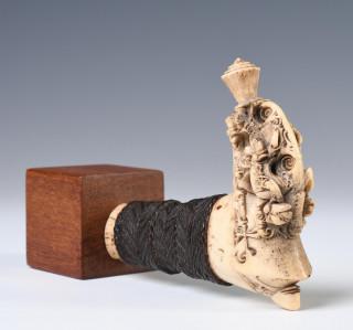 with an intricately carved face with various spiraled details and partly covered with braided plant fibre.